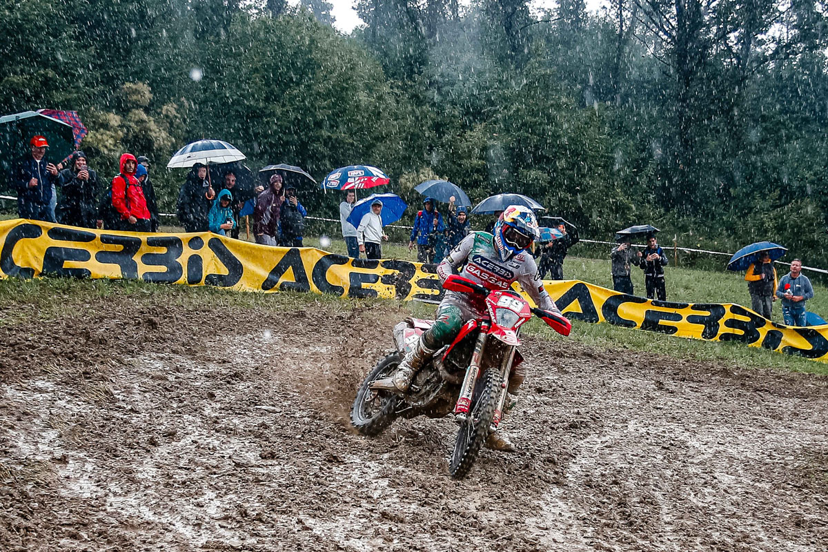 After the scorching heat on day one at round four of the Paulo Duarte FIM EnduroGP World Championship in Bettola, Italy, day two was a contrasting mud bath. Heavy overnight rain ensured the dust of day one would be a distant memory as riders battled slippery special tests, littered with lots of mud holes.