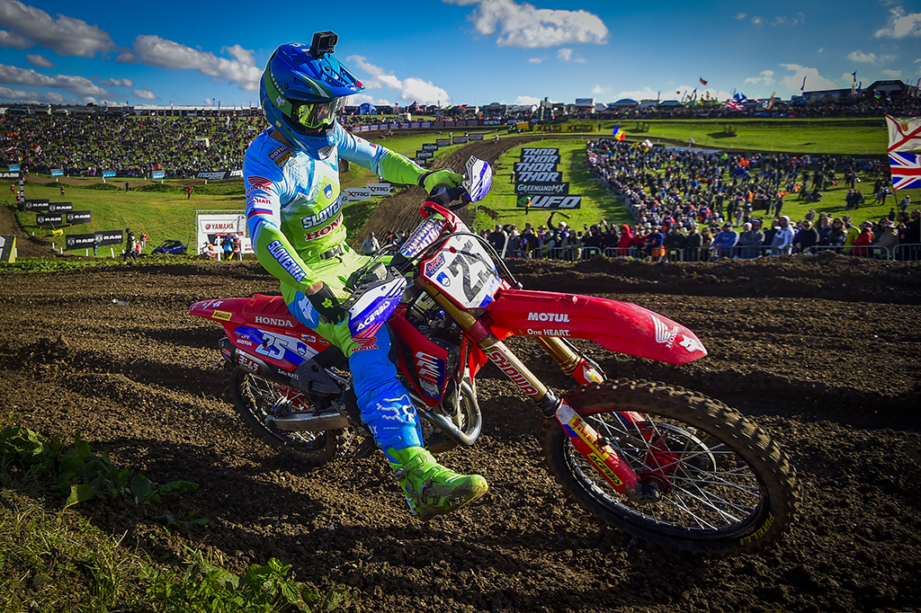Crendon Tru7 Honda rider Conrad Mewse, with the locals in the crowd urging him on, had passed Fantic Factory Racing star Glenn Coldenhoff for sixth on lap two, and closed in on Dos Santos, who had Monster Energy Yamaha Factory MXGP pilot Andrea Bonacorsi already giving him hassle! The Brazilian lost both positions in the space of two corners, before an inspired Mewse got past the Italian a lap later! The Brit was relishing the technical conditions, and his fourth position put the host nation in fourth for the day!