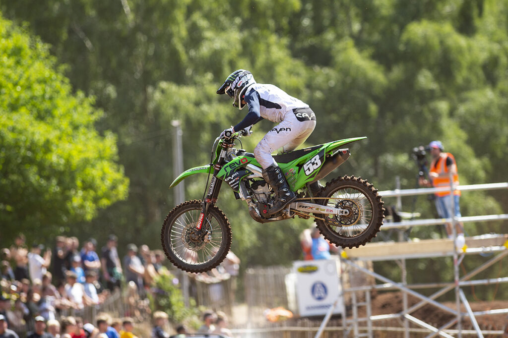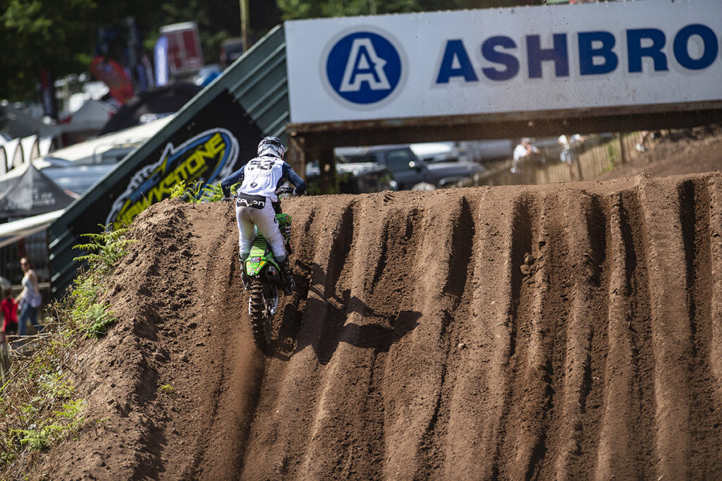 Team Manager Mark Yates and his crew inspected the damage when the KX250 got back to the pits. “The crash had damaged the electric starter, and with a bit of adjustment to the switch, she started first time. We had fitted a second button to one of our bikes after Culham, but this was more of a spare machine that we hadn’t fitted it to yet.”