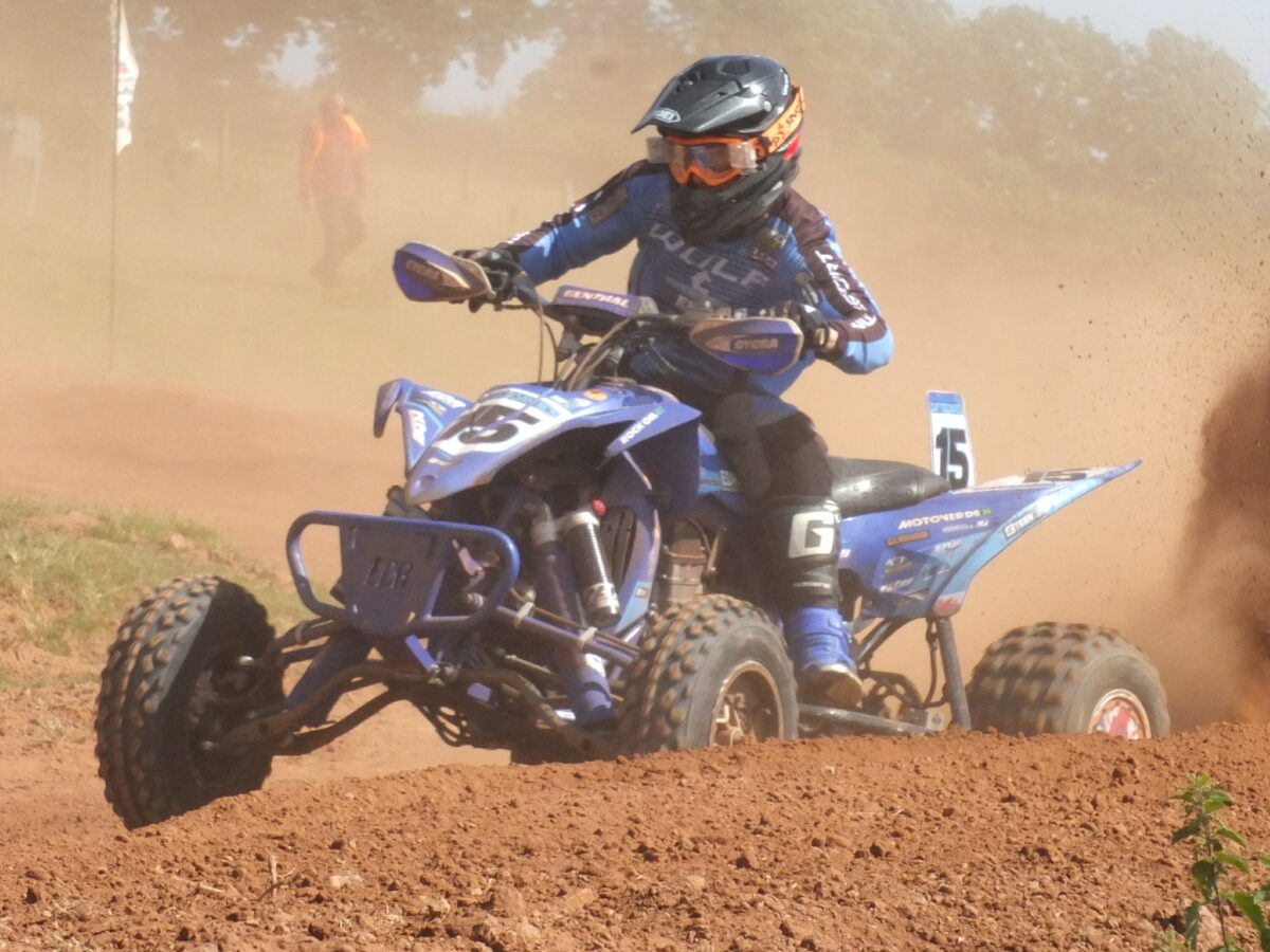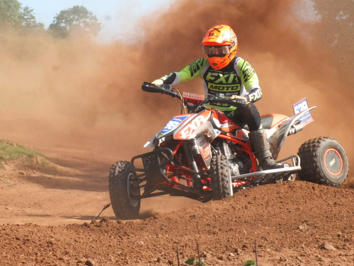 Unfortunately, the weather was unpredictable. There were showers forecast which should have kept the dust down, but the sun was bright and the wind breezy which dried the track out and left it dry and dusty and needed watering in places. When the rain did arrive, it wasn’t showers, it was thunder and lightning, then the skies opened with several downpours which made the track slippery. Whilst the bikes did get round, racing each other was more difficult, after the third massive down pour there was a riders meeting and a vote, which led to the decision to stop racing after two races each.