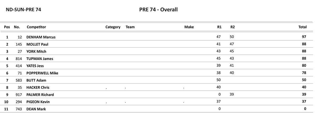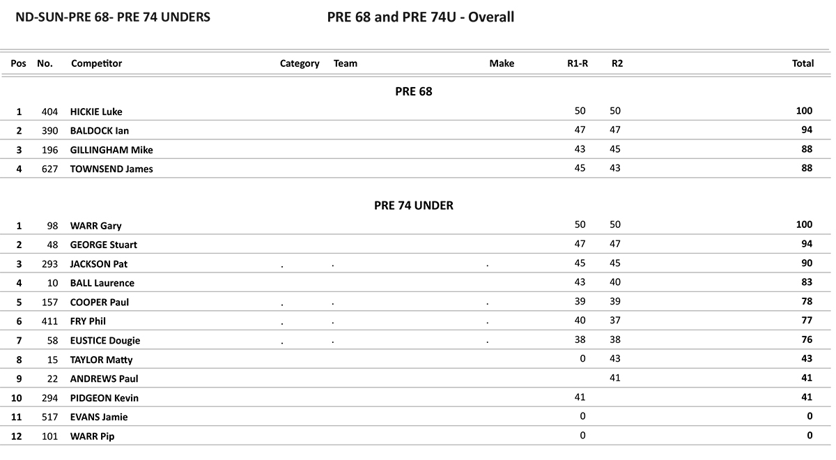 The Pre 74 Under 250 class saw a fine display of riding from Gary Warr on his 250 Phantom OSSA on both days winning all four races with Stuart George on his 250 Pursang Bultaco second to Warr in all races and third overall on day one was to go to Jamie Evans with the better result over Pat Jackson in the second race, but it was Jackson who was to take third overall on day two with two third place finishes, whereas in the Pre 74 over 250 class it was Adam Butt on his 350 Hickie BSA was unstoppable on day one with Marcus Denham second to Butt in both races on his 380 CZ with fellow 380 CZ rider Paul Mollett taking third overall but on day two Butt won the opening race from Denham with James Tupman on his 500 BSA third but in the second race there was no Butt and it was Denham who took the win from Mollett with Mitch York third which was to give Denham the overall, Mollett second overall and York third overall.