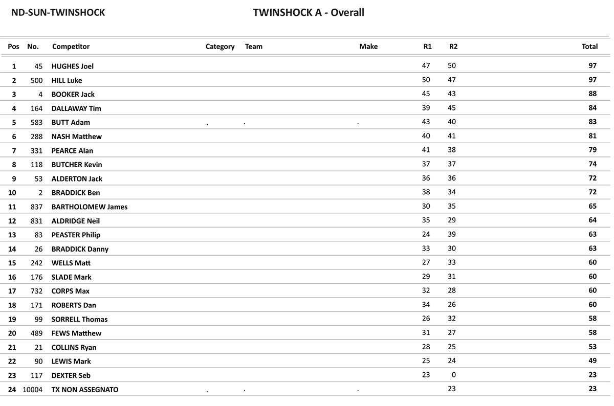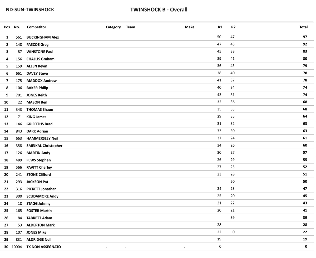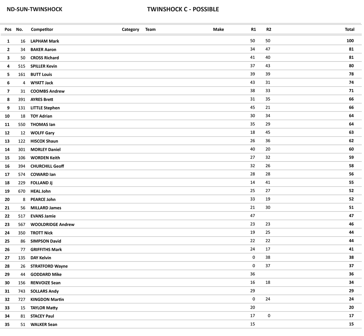 The Twinshock C class saw Kelvin Day on his 465 YZ Yamaha take the overall with a second and a win with Mark Lapham taking second overall even though he was tied on points with Aaron Baker he had the better result in the second race whereas on the Sunday there was no stopping Lapham who won both races to give him the overall with Aron Baker and Richard Cross tied on points for second overall but with Baker beating Cross in the last race he took second overall.