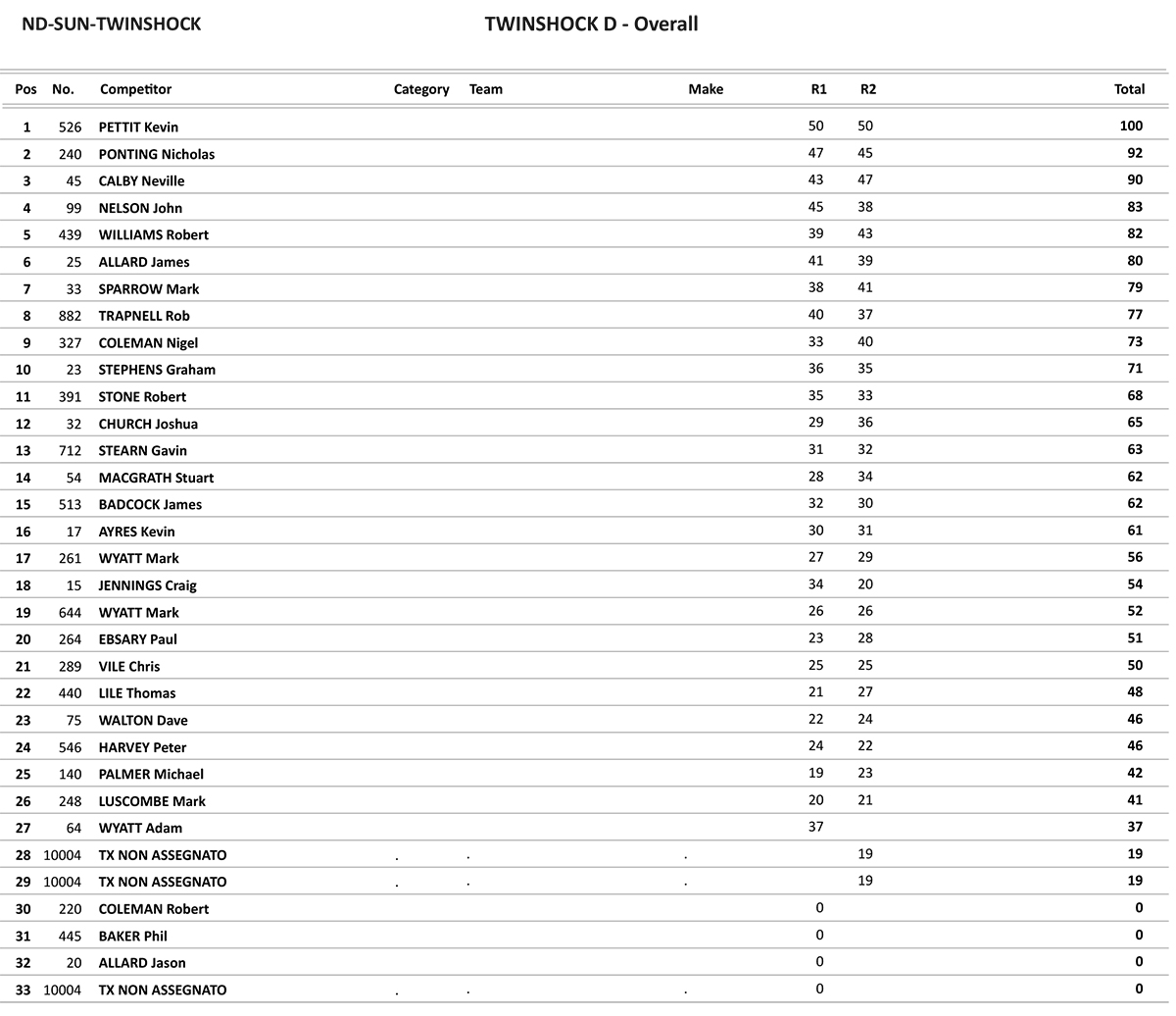 The Twinshock D class the weekend belonged to Kevin Pettit on his 600 YZ Yamaha who won all four races, Nicholas Ponting and Neville Calby tied on points on the Saturday, but it was Ponting who took it beating Calby in the second race and on the Sunday Ponting and Colby took second and third overall again.