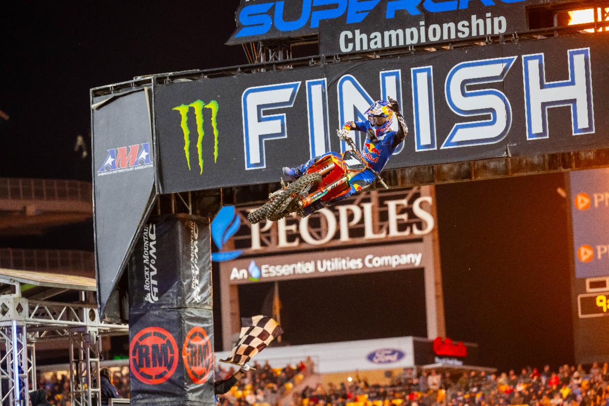 “[I felt] a little bit of everything, man. It’s been a heck of a fight, and a rough two weeks, especially last week. So, it was much needed tonight. It was an incredible main event. We were going for it and if I made one little mistake, I knew he was going to get me. So, you want to talk about pressure, that was a lot. I’m just stoked on myself to rebound after last week to pull the holeshot and lead every lap with that kind of pressure. Man, it’s not easy to do. I’m stoked for myself, and I’m stoked for my team. I want to give it up to them. We made a bike change this week that was awesome… Last weekend was pretty hard on me and it’s great to get back up here and get another win, get the ball rolling, obviously stop the momentum that Chase had a little bit. But he’s going to be firing. I know he’s a hellova competitor.” – Cooper Webb (#2 in photo), when asked what he was feeling after the win, whether it was exhaustion or relief.
