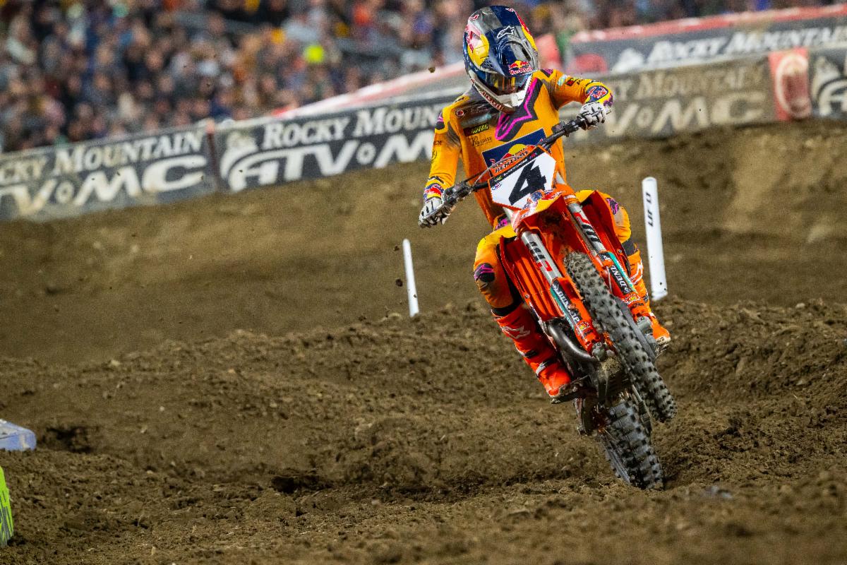 “It was just hard. I knew I could skim [the whoops] for a little bit but I was using a lot of energy doing that. They’re really far apart, so just wasn’t getting too much drive and Cooper wasn’t losing too much time jumping. So, I went to the jump line, made one mistake and went off the track, but other than that I felt like I was pretty solid. Coop rode a really good race. I pressured him the whole time and he didn’t make a mistake. Every time I tried to push a little bit more, I’d make a mistake. It was a tough track. You couldn’t really push too hard and there wasn’t a whole lot of separation. He rode a great race and [I’ll] come back next weekend and try to do better, but it was a tough pill to swallow losing that race. But it is what it is, and we have two more.” – Chase Sexton, when asked about his decision to switch from blitzing the whoops to jumping through the whoops.