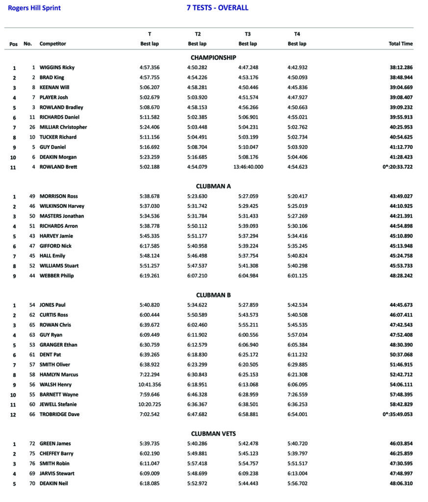 The Clubman A class also saw some close competition with the top 3 all finishing within 30 seconds of each other. In the end it was Ross Morrison who took the win and set the fastest test time of the class. In Second place was young Harvey Wilkinson who secured enough points to earn himself third in the championship standings, great effort! Close behind in third on the day was Johnathan Masters, just 11 seconds back in the end.