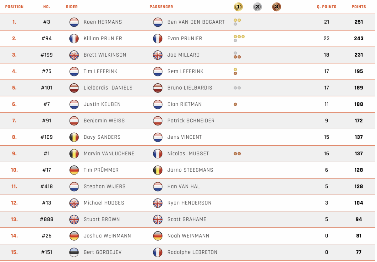 The identical twin brothers, now just nineteen years of age sit fifth in the standings after a shaky start to 2025. They are just six points behind another set of brothers, Tim and Sem Leferink from the Netherlands. You need to add a further thirty-six points however, before you reach the British crew of Brett Wikinson and Joe Millard in third. Then it becomes very interesting indeed with just twenty points splitting the top three teams. This is the closest Wilkinson and Millard have ever been to the red plate, and they can almost smell it.