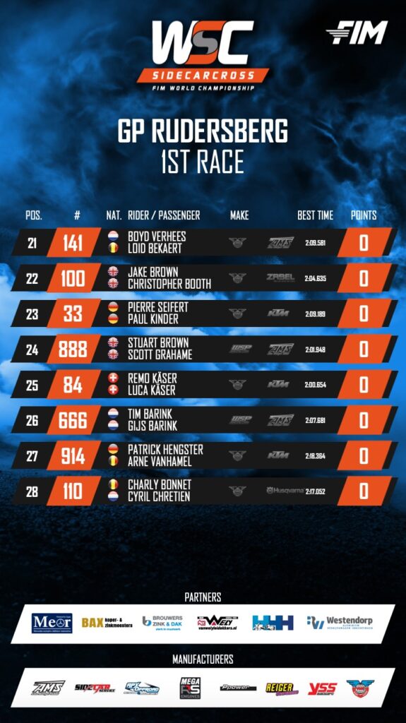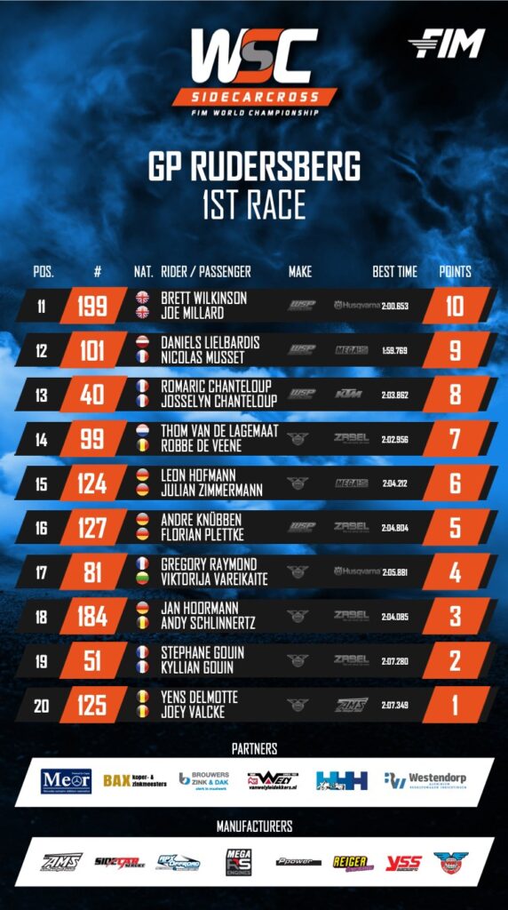 Wilkinson, meanwhile, had rejoined in twenty-fourth, battling up the order to make it home in eleventh place. All was not lost for the British crew, but race two would be an uphill task. At the front the chase was on, then suddenly, Prunier was also upside down in a catastrophic move involving back-markers. Fortunately, as with Wilkinson, they were both fine to resume, recovering to fourth place. This made the title effectively a two-horse race going into race two, although Wilkinson was still in the hunt.
