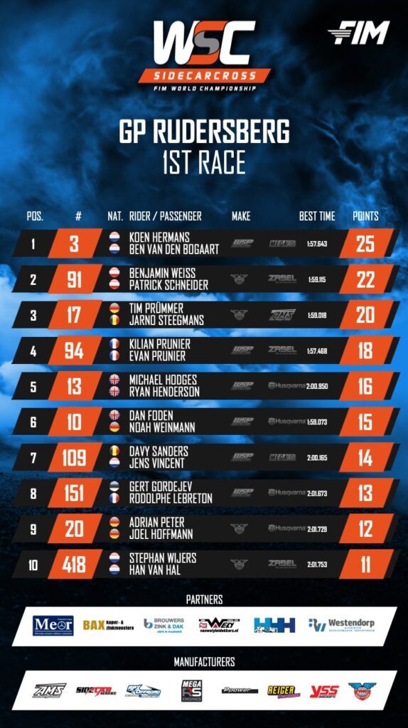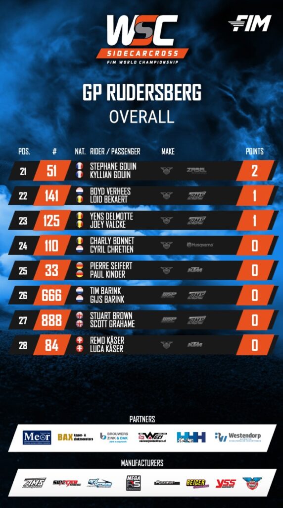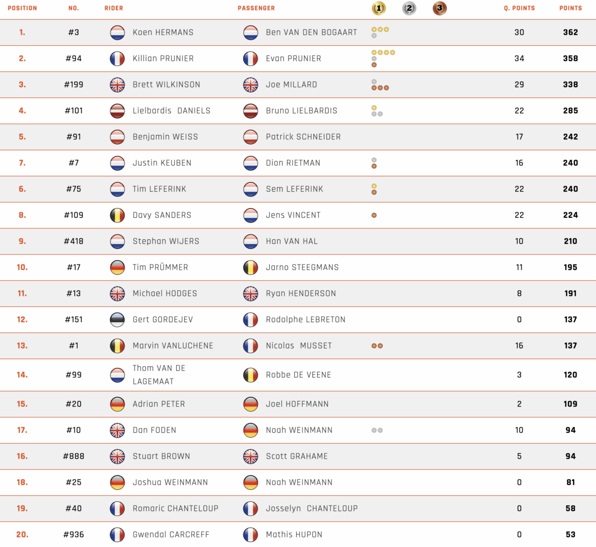 The Austrians Weiss and Schneider made it home third on the track as they vanquished Prummer/Steegmans in the closing stages. Ironically, Dan Foden was handed a noise penalty, affecting his points position. Morally though, he and Weinmann had been the men to beat. This penalty moved the top five up one place handing Hermans victory. The action all the way down the field was terrific but the drama befalling two of the top teams defied all expectations.