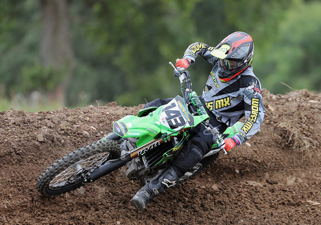 Having already won 6 out of 9 MX1 Seniors moto’s in the series, Joshua Senter finished the job in style at Nympsfield with a brilliant maximum. Making it a great day for the Senter family, Joshua’s Dad Scott took 2nd overall on the day with eventual series runner-up Jay Rumbold in 3rd. In the opening moto on Sunday though it was Apex track builder Lee Mitchell in control before Joshua Senter came through on lap three to take the win. After gating 5th, Scott Senter got up to bag 3rd from Elliot Woodward, Jack Tompkins and Richard May.